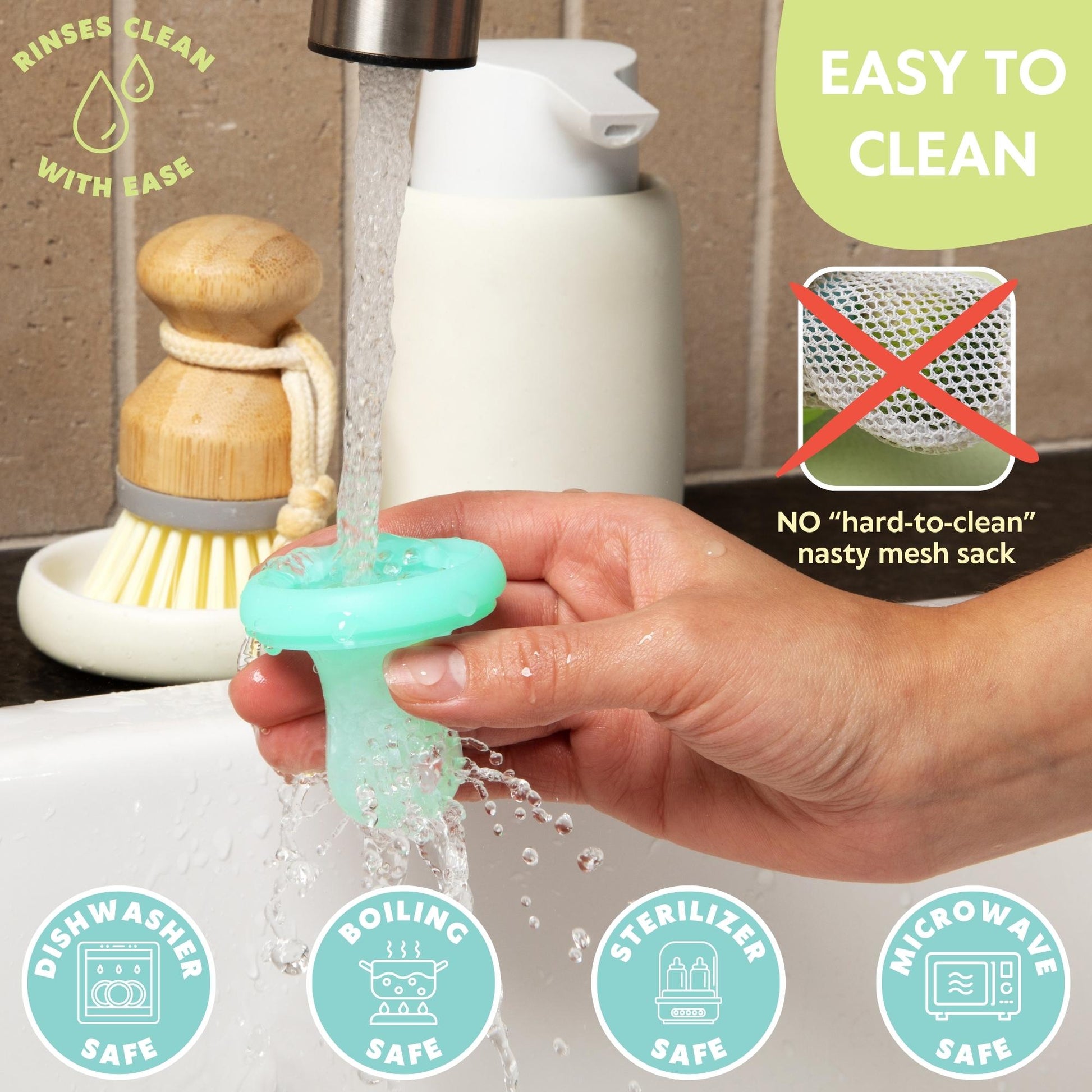 - EASY TO CLEAN: A no “hard-to-clean nasty mesh sack” two-piece silicone design is super easy to disassemble and wash by simply rinsing it with warm soapy water until it is ready for use again. The feeder can be cleaned in a steam sterilizer, boiling water, or a microwave. It's also top-rack dishwasher safe, making cleanup a breeze. No hidden corners, joints, cracks, or edges exist for bacteria or mold to harbor.